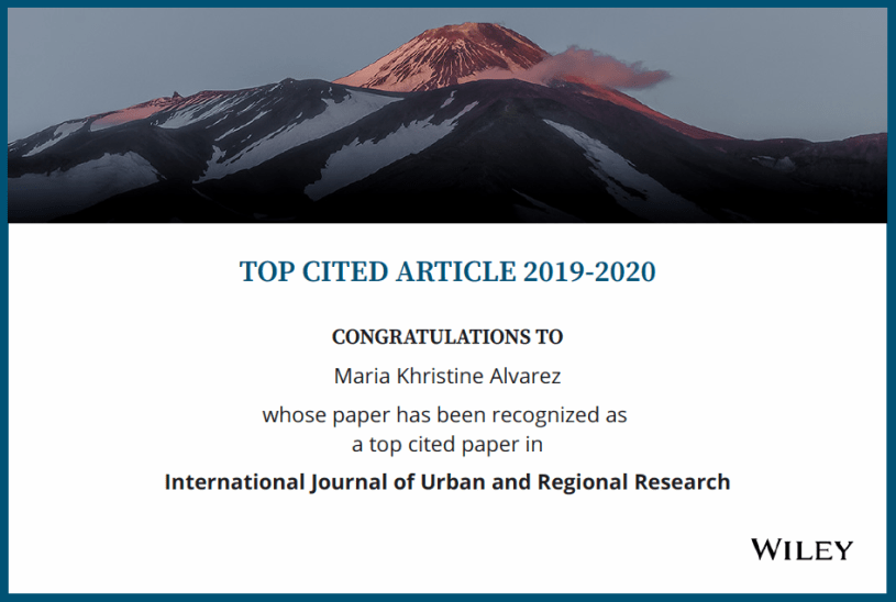 My paper with Kenneth Cardenas, “Evicting Slums, ‘Building Back Better’: Resiliency Revanchism and Disaster Risk Management in Manila”, was recognised as a Top Cited Article (2019-2020) in the International Journal of Urban and Regional Research (IJURR), the world’s consistently top ranking urban studies journal.