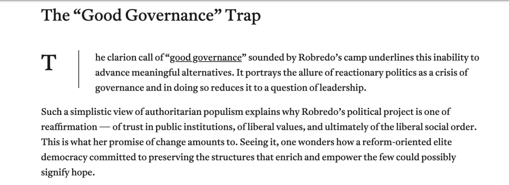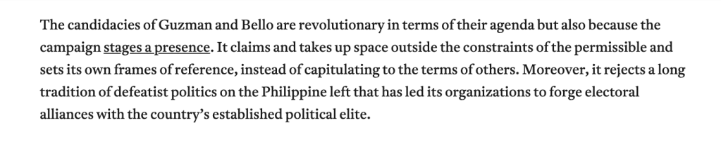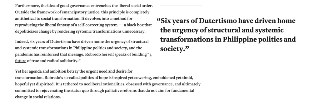 Public Scholarship, PUBLICATIONS ESSAY | The Philippine Left Has an Opportunity to Break the Country’s Political Mold Date: March 4, 2022Author: Maria Khristine (Tin) Alvarez 0 Comments The full text is permanently accessible at Jacobin’s website, and available to download at this link. Favourite excerpts follow below: Share this: Click to share on Facebook (Opens in new window) Facebook Click to share on X (Opens in new window) X Click to email a link to a friend (Opens in new window) Email Like Loading... Related